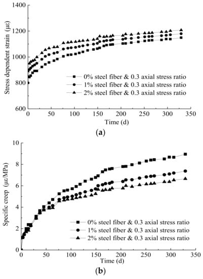 Figure 7 shows variations in the stress-dependent strain, specific creep, and creep coefficient of RPC samples containing different steel fibre contents with time. In Figure 7a, the stress-dependent strain increases with increasing steel fibre content. This is because at the same axial stress ratio, the samples with more steel fibre content bear greater stress, causing more stress-dependent strain. As shown in Figure 7b,c, during the later period after loading, the specific creep and creep coefficient of the RPC samples decrease with increasing steel fibre content. For the samples without steel fibre, the ultimate specific creep is 8.95 με/MPa. However, for the samples with 1% and 2% steel fibre content, the ultimate specific creep is 7.37 and 6.65 με/MPa, respectively. The ultimate specific creep of the RPC samples with 1% and 2% steel fibre content are thus 17.7% and 25.7% less, respectively, than that of the RPC samples without steel fibre. For the samples without steel fibre, the ultimate creep coefficient is 0.40. However, for the samples with 1% and 2% steel fibre content, the ultimate creep coefficients are 0.35 and 0.32, respectively. This means that the ultimate creep coefficients of RPC samples with 1% and 2% steel fibre content are 12.5% and 20.0% smaller, respectively, than that of the RPC samples without steel fibre. The positive effect of steel fibre for reducing creep, particularly during the later period after loading, can be explained as follows: