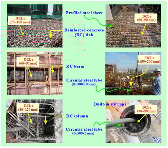 The combined compressive strength (f*,300,CC) predicted using Equation (4) is generally higher than the measured one. This is mainly because Equation (4) is based on data from previous experiments in which the maximum aggregate size of fresh concrete did not exceed 25 mm. Spaces between the mold and the DCLs and gaps between adjacent DCLs may have been better filled with fresh concrete in that work. The fresh concrete’s aggregate size in this study ranged up to 35 mm. This may have allowed some spaces between the mold and the DCLs and some gaps between the adjacent lumps to be filled only with mortar without coarse aggregates. If the homogeneity of the compound concrete was poorer, that could explain the lower measured compressive strength.