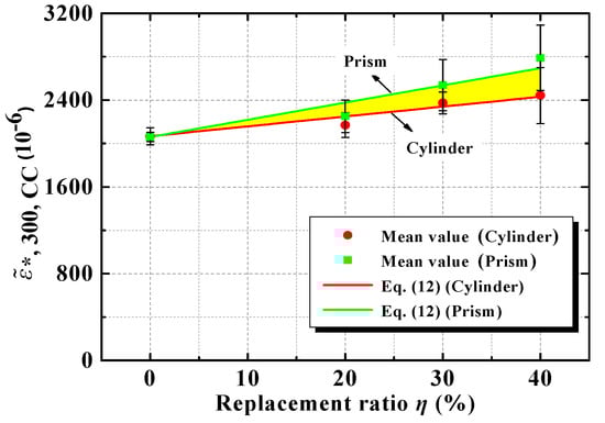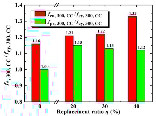fcy,300,CC. For the prismatic and cylindrical specimens with replacement ratios of 20%, 30%, and 40%, the average value of that strength ratio was about 1.13, which is 13% higher than the
