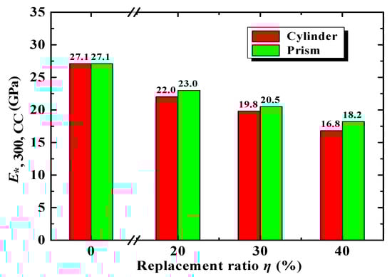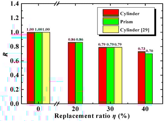 Figure 10 shows that for a given replacement ratio, the combined elastic modulus of a prism is always larger than that of a cylinder, though the difference is generally small. For the prismatic and cylindrical specimens with replacement ratios of 20%, 30%, and 40%, the average value of