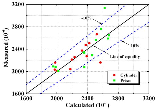 The combined compressive strengths of the cubic, prismatic, and cylindrical specimens in Groups 2, 3, and 4 predicted using Equation (4) were compared with the measured results presented in