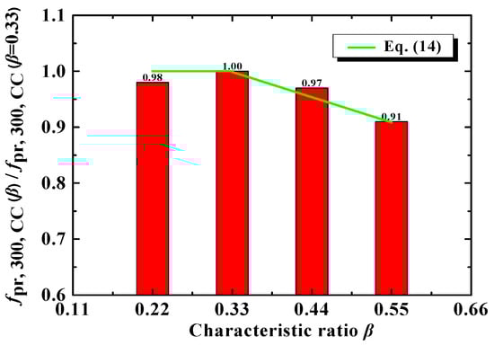 Comparing Equation (14) with Equations (15) and (16), it can be seen that with increasing β, the rate of decreasing compressive strength is in the order prism > cylinder > cube. The effect of the characteristic size of the lumps on compressive strength is greatest for prisms and least for cubes. This is probably an effect of the end restraints caused by the machine platens on lateral expansion. This would be more significant for cubes than for the lateral expansion of cylinders and prisms. For prisms, the non-uniform stress distribution caused by the presence of sharp edges would be expected to amplify the impact of characteristic lump size on compressive strength.