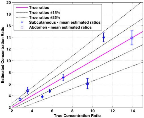 Although in some cases, the ratios were estimated with an error of 35%, the sensitivity and specificity still remained high. This may be explained by the fact that for low concentration ratios, an error of 35% still resulted in a relatively low difference between the true and estimated ratio. For instance, in one of the cases, the true ratio was 3.57 and the estimated ratio was 4.86, which is equivalent to 36% error. However, the difference between the true and estimated ratio is 1.29, a rather low difference that will not cause false predictions. In the high concentration ratios, the big errors caused a larger difference between the true and estimated ratio values, but the cutoff value was relatively distant from the true ratio. As a result, in those cases, even big errors did not cause too many false predictions. On the other hand, the concentration ratio values that were close to the cutoff value were estimated with a very high accuracy so the sensitivity and specificity remained high. We can assume that our method requires high accuracy in ratios that are close to the cutoff ratio but can afford bigger errors in the extreme cases of low and high concentration ratios since big errors in these values will not result in false predictions.