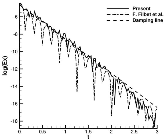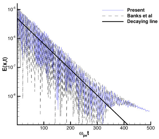 where and . The 1D computational domain is discretized with 64 grid points. In microscopic velocity space, 128 discrete points are used. To compared with the result of Reference [57], the thermal electron-ion collision frequency is set to be 0.05. The amplitude of the perturbation’s electric field E is plotted on a log scale as a function of time in Figure 13.