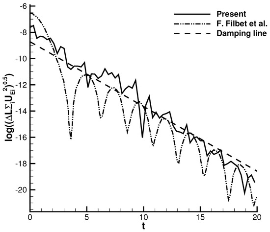 Another benchmark result is -norm of the distribution function. Variation of -norm is often used to show the rate of negative values because the global mass should be preserved. This value is used to test the characteristics of conservative of UGKS in simulation for plasma flow. The comparison result of -norm between UGKS and Filbet et al. [12] is given in Figure 5.