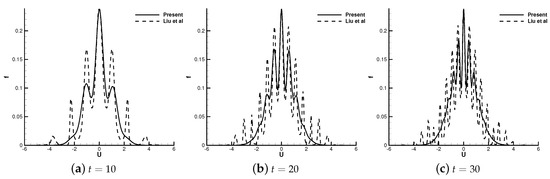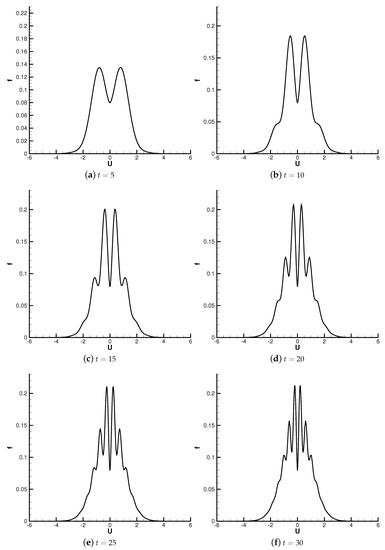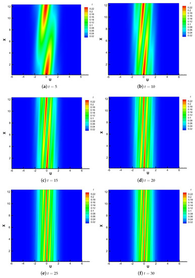 Figure 6 shows the distribution function in velocity space. To give a better description of particle distribution in phase space, the distribution function in the space is presented in Figure 7. Distribution functions at for are given in Figure 8 to compare with the results in Reference [35]. The heaps of distribution profiles fit with each other. However, difference between Poisson’s equation in this paper and complete Maxwell equation causes inconsistent results. To simplify computation and reduce computational cost, only electric Poisson’s equation is considered. However, in simulation of plasma in electric field, it is an accurate method.