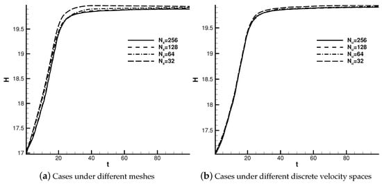 In nonlinear Landau damping case, nonlinear effect dominates the evolution of particle motion and electric field. UGKS successfully captures the unsteady and highly nonlinear waves in plasma. Numerical scheme proposed in this paper provides an accurate method for highly non-equilibrium plasma flow simulation. Time development of entropy under meshes with different cell size and discrete velocity space with different number of points are given in Figure 9. The computation results convergence at and for present method.