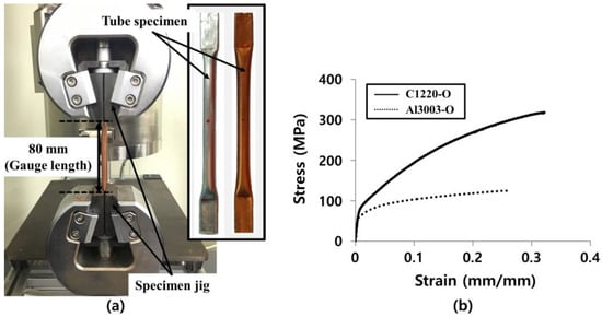 For the FE analyses, the stress and strain curves of the tube and fin were obtained experimentally using 120-mm Al and Cu tubes in tensile experiments with a tensile testing machine (Model 310™, R&B Company Ltd., Dajeon, Korea). Tensile experiments were performed on the Al and Cu tubes with a gauge length of 100 mm at a load speed of 0.1 mm/s while gradually increasing the load until the occurrence of fractures (Figure 1a). In the current study, we have measured strain from the change in the grip-to-grip length relative to the initial grip-to-grip length. The results of the tensile experiments revealed that the Al and Cu tubes had fractures in the central area. The stress–strain curves are shown in Figure 1b.