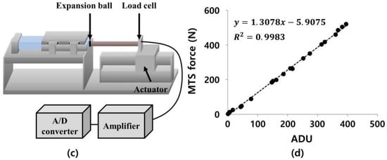 The expansion force rate and its standard deviation were obtained to investigate the effect of the expansion force magnitude on the amount of adhesion. The expansion force profiles were recorded as an analog signal and converted to a digital signal (ADU, 1 ADU = 20/4096 volts) using commercial software (Kwon GRF, Visol, Gyeonggi-do, Korea). The 100-kgf load cell was calibrated using ADU values acquired with 25 cycles of a sinusoidal load at 10 Hz with a stress ratio of 0.1 (50–500 N). The results were then compared with load values obtained from a 200-kgf capacity load cell (BCA-200, TESTA, Busan, Korea) installed in an MTS machine (MTS 810, MTS Systems Corp., Eden Prairie, MN, USA). The following linear calibration equation was obtained: Load (N) = 1.3078 × ADU − 5.9057 (Figure 1d).