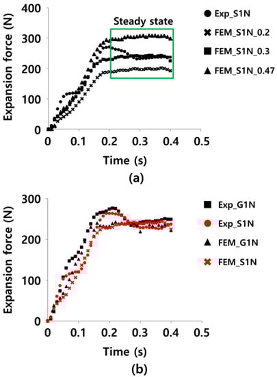 (a) Effects of friction coefficients (0.2, 0.3, 0.47) on expansion forces for the S1N group; and (b) comparisons of expansion forces between the expansion experiments and FE analyses for the S1N and G1N groups.