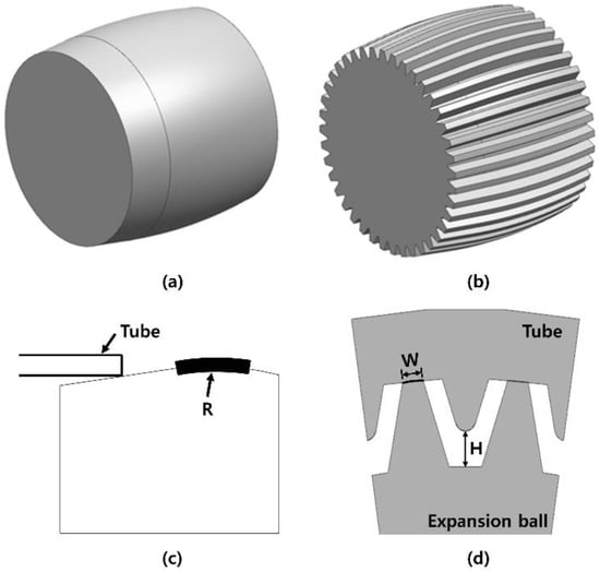 The effect of the expansion ball shape was investigated using an expansion ball without grooves on the surface (Type 1) and one with grooves (Type 2). The groove size was based on the size of the tube’s inner grooves. The Type 2 ball has 40 grooves for distributing the applied load by increasing the contact area between the ball and tube surface. The Type 3 ball was generated by reducing the grooves’ top width () from 0.2 mm to 0.1 mm to analyze the influence of the contact area. For Type 4, an additional free gap ( = 0.1 mm) was made between the ball and tube-groove peak point on Type 3 to remove the contact point between the tube-groove and ball. Type 5 was produced by decreasing the number of expansion ball grooves of Type 3 from 40 to 20. Type 6 and Type 7 were designed with surface radii of = 5.3 mm and = 7.9 mm, respectively, and without expansion ball grooves to analyze the influence of the radius of curvature on the tube expansion performance (Figure 4 and Table 2).