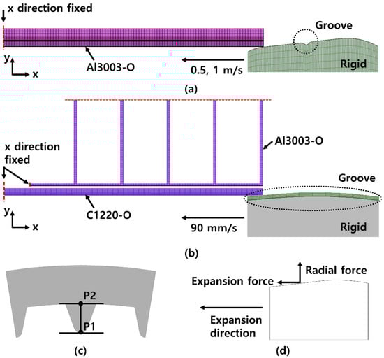 FE models and boundary conditions for the analysis of (a) Al tube and (b) Cu tube expansions; (c) reference points P1 and P2 for calculating the tube’s inner groove deformation; and (d) axial and radial forces.