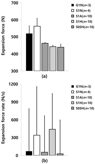 A one-way analysis of variance (one-way ANOVA) was performed using commercial software (Excel, Microsoft, Seattle, WA, USA). The analysis was carried out to determine whether there was a statistically significant difference in the expansion force between the two different expansion speeds (0.5 m/s and 1 m/s), between the two lubricant types with different viscosities (DH173A and DH23H), and between the two expansion balls with and without the lubricant groove. The significance level was set at α = 0.05.