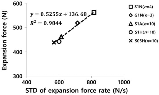 The expansion force rate, which is differentiation of the expansion force with respect to time, can be used to represent the occurrence of adhesion in the tube’s inner grooves []. The standard deviation of the rate was the highest for S1N (~815 N/s), which also produced the highest expansion force. However, the standard deviation of S05H, which had the lowest expansion force, was ~568 N/s (Figure 6b and Table 3). According to our previous study [], the adhesion of tube’s inner grooves can be associated with the standard deviation of the expansion force rate, because the sudden increase in the expansion force has a close relation to the occurrence of adhesion in the tube’s inner grooves during the expansion. In the current study, a linear correlation (R2 = 0.984) was observed between the expansion force and the expansion force rate’s standard deviations (Figure 7). This result indicates that because a large expansion force can lead to a large deformation of the tube’s inner grooves, the tube’s inner groove deformation, which is difficult to be experimentally measured, can be estimated by calculating the standard deviation of the expansion force rate.