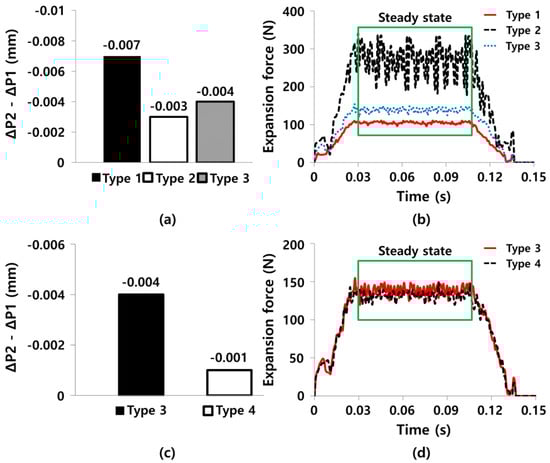 For Type 4, the expansion force and ΔP2 − ΔP1 were 131.8 N (5% lower than Type 3) and −0.001 mm (75% lower than Type 3), respectively. This occurred because there was no contact between the expansion ball and the tube’s inner groove peaks for Type 4, which led to a significant decrease in ΔP2 − ΔP1. The expansion force slightly decreased due to a decrease in the contact area between the tube and ball (Figure 8, Table 4).
