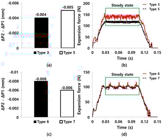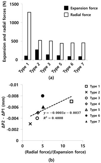 For Type 6, the expansion force and ΔP2 − ΔP1 were 91.6 N and −0.008 mm, respectively. For Type 7, the expansion force and ΔP2 − ΔP1 were 88.9 N (3% lower than Type 6) and −0.006 mm (25% lower than Type 6), respectively. This result was caused by the curved surface of Type 7 ( = 7.9 mm) which was smoother than that of Type 6 ( = 5.3 mm). Therefore, the Type 7 ball was effective in dispersing the load generated in the tube’s inner grooves, resulting in a decrease in ΔP2. For Type 6, the expansion force and ΔP2 − ΔP1 were 91.6 N and −0.008 mm, respectively. The ΔP1 compared to Type 6 (Figure 9 and Table 4).