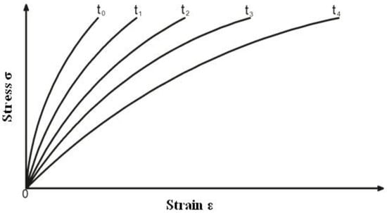 Figure 1 represents creep curves for a material at various constant stresses. Let us draw several, for example, four vertical lines, corresponding to time moments t1, t2, t3, and t4. Each vertical line crosses four creep curves corresponding to stresses σ1, σ2, σ3, and σ4. Drawing horizontal lines from specified cross points, one can find four strain values ε1(t1), ε2(t1), ε3(t1), and ε4(t1) on the vertical axis, corresponding to time t1. According to known four values of stress and four values of strain, one can construct an isochronous creep curve corresponding to time moment t1. Making similar actions, one can construct isochronous creep curves for the material at different load durations (Figure 2). Isochronous curves allow the visual evaluation of the character (linearity or nonlinearity) and nonlinearity degree of deformation for material. It is often in practice that isochronous curves are similar. The similarity property provides an opportunity to obtain all other isochronous creep curves of a material, if one of them is known.