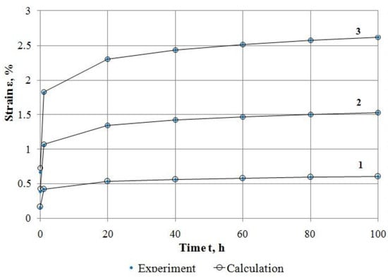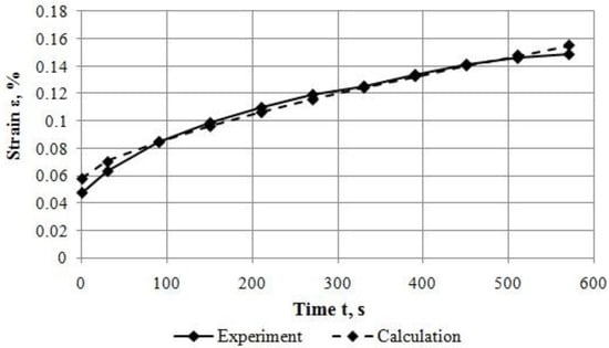 Then inserting sequentially the obtained values for parameters α, ε0, and δ into Equation (5), we calculate the values for creep strain ε ( t i ) = ε i   ( t i ,   α ,   ε 0 ,   δ ) .