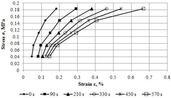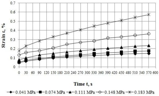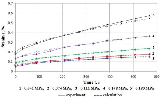 As it is known, creep curves of materials, depending on stress level and temperature, can have two or three characteristic strain sites [26,27,28]: site I with unstabilized creep, site II with stabilized creep, and site III of accelerating creep.