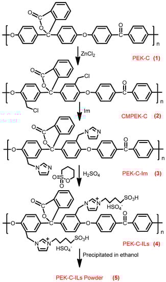 PEK-C was purchased from the Xuzhou Engineering Plastic Factory (Xuzhou, China). The number-average molecular weight () of PEK-C was 20,000. Inulin (polysaccharide: 93.2%, initial reducing sugar: 3%, moisture and ash: 3.8%) was purchased from Gansu Likang Nutrition Food Corporation (Lanzhou, China); Chloromethyloctylether (CMOE) was synthesized in our lab according to the method described in literature []. Imidazole, 1,4-butylesultone and zinc chloride were purchased from Aladdin Chemical Company (Beijing, China); Diethyl ether and other chemicals (AR grade, purity 99.8 vol. %) were commercially available and used without further purification.