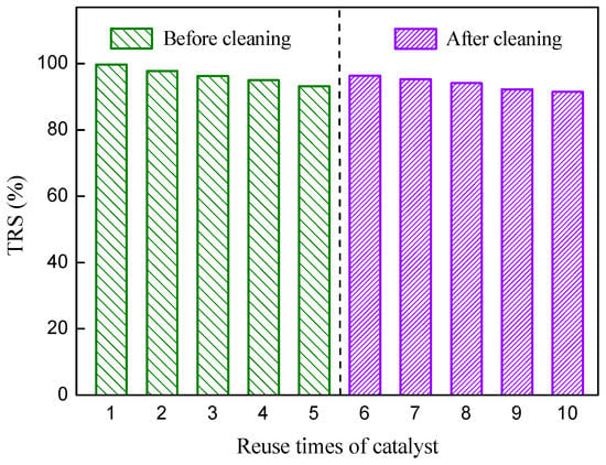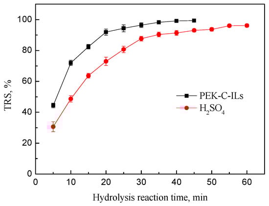 The reusage of catalyst is highly preferable for reducing cost of the production and potential environmental pollution. The PEK-C-ILs catalyst could be fully separated from hydrosate solution by filtration for recycling. After drying under vacuum at 50 °C, it was subjected to the next new hydrolysis solutions. After used five times, the catalyst powder was washed with deionized water. Then it was used for next five rounds of hydrolysis experiment. The catalytic performance of the recycled PEK-C-ILs was shown in Figure 12. After the first and fifth rounds of hydrolysis, the TRS yields were 99.7% and 94.5%, respectively. The results indicated that the catalyst could be reused five times with slightly decrease of 5.2% in catalytic activity. The reason for the decrease of the TRS seems to be primarily due to the active sites covered by reducing sugar in the catalysis process and a little shrinkage which resulted from oven dry after each hydrolysis. The recycled PEK-C-ILs powder after five rounds of use was washed with deionized water. After PEK-C-ILs powder dried, the hydrolysis reaction was conducted in the same conditions. Its catalytic activity recovered by 1.7%. After the sixth and tenth rounds of hydrolysis, the TRS yields were 96.2% and 91.5%, respectively. Compared with the original PEK-C-ILs powder catalyst, the PEK-C-ILs catalyst after 10 rounds hydrolysis showed only 8.2% loss of catalytic activity (Figure 12).