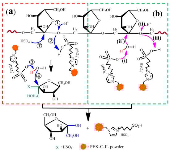 Based on the previous study [], two catalytic mechanism of inulin polysaccharide over PEK-C-ILs catalyst were proposed in this work and shown in Figure 3. As displayed in Figure 3a, when the glycosidic oxygen was being protonated by the acid catalyst, anion HSO4− as nucleophile was first attacked the anomeric carbon of the fructose molecule, leading to breaking of the glycosyl bond and the –SO3H groups of cation acts as proton donor for glycosidic oxygen. Then, the oxygen atom of a water molecule made a nucleophilic attack at the anomeric carbon concomitantly with deprotonation by the –SO3H group, completing the catalytic cycle of polysaccharide hydrolysis. The another path is synergistic hydrolysis process of cations. As displayed in Figure 3b, the oxygen atom of a water molecule was attacked by the deprotonation of the –SO3H groups in the cation. Then the glycosidic oxygen atom was being protonated under acidic condition, at the same time, the hydroxyl group of the water molecule attacked the anomeric carbon, resulting in cleavage of the glycosyl bond. The –SO3H groups in another cation acted as a proton acceptor for the other cyclic catalytic process. It should be noted that maybe there is a competitive relationship between them. And eventually the hydrolysis reaction was dominated by synergistic effect of anion and cation (Figure 3a) due to its low activation energy []. However, for sulfuric acid, its hydrolysis effect as a catalyst is poorer than PEK-C-ILs because the hydrolysis process only relied on the released hydrogen ion []. Therefore, this chemical and macroporous structures of PEK-C-ILs catalyst made it better hydrolysis active.