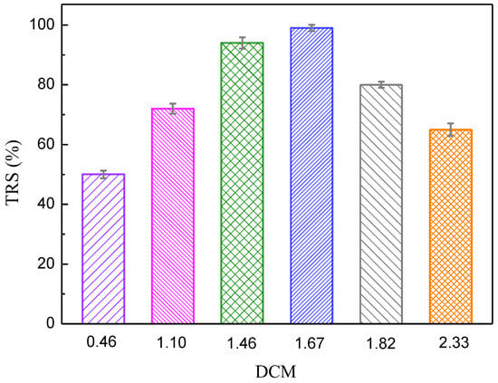 The first step of the study was designed to obtain the optimum DCM for high TRS yield of inulin hydrolysis using PEK-C-ILs as the catalyst. Figure 4 illustrates the effect of DCM variation on TRS. It is evident that the TRS increased with the increase of the DCM. The maximum TRS of 98.7% was obtained with 1.67 of DCM. However, with increase in DCM up to 1.82, the TRS decreased to 81.3%. This can be attributed to the molecules chain twine of ILs around each other, leading to the mutual coverage of active sites. Henceforth, it can be concluded that the DCM variation has a great effect on the TRS and the optimum DCM which obtained the maximum reducing sugar using the PEK-C-ILs catalyst is 1.67.