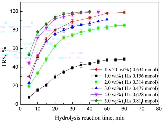 The amount of PEK-C-ILs catalyst was varied in a range of 1.0–5.0 wt % to carry out the hydrolysis reaction of inulin at 65 °C. The corresponding results were shown in Figure 5, we can see that the catalyst dosage has a profound effect on TRS of inulin. When the catalyst dosage increased from 1.0 wt % to 4.0 wt % (1.02–5.11 mol %), the TRS increased obviously from 52.1% to 98.7%. With further increase of the dosage, the TRS of inulin change slightly. This result may be due to the fact that the greater the catalyst dosage, the more available active sites for the hydrolysis reaction. However, when catalyst dosage was above 4.0 wt %, the active sites were excess and could not been fully utilized for inulin hydrolysis, so that the hydrolysis rate of inulin had no significant increase. In addition, the comparison result between PEK-C-ILs powder catalyst of 4.0 wt % (0.628 mmol ILs) and homogeneous ILs clearly showed that the catalytic activity of ILs has been well improved after immobilization.