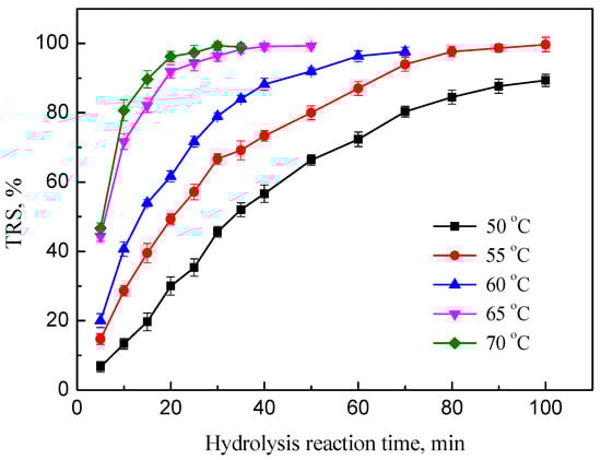 The reaction temperature is an important factor for the activity of catalysts in the most reaction systems. Therefore, hydrolysis of inulin with PEK-C-ILs catalyst was performed at different temperature in the range of 50–70 °C to find out the optimum temperature of hydrolysis reaction. The effects of the TRS of inulin at different temperature were exhibited in Figure 6. The results suggested that the increment of temperature is apparently favorable to accelerate the hydrolysis reaction. However, when reaction temperature was above 65 °C, the hydrolysis rate had no marked further change after 25 min. At this moment, with the increase of temperature from 50 °C to 70 °C, the corresponding TRS yields increased from 35.3% to 97.3%.