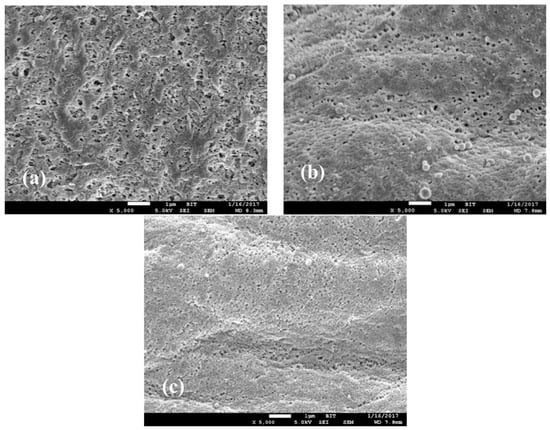 Pore size was also an important parameter for the powder catalyst. The PEK-C-ILs powder catalysts with different pore size were prepared by adjusting the polymer concentration in 4 wt %, 6 wt % and 8 wt %, respectively. Using ImageJ software [], the pore size of the PEK-C-ILs powders was analyzed base on the SEM images of Figure 7. Because the surface flateness of powder is low, it is difficult for the image analysis software to capture the macropore information. We prepared plate PEK-C-ILs films in the same preparation conditions as powders so as to test the pore size. The analysis results were listed in Table 2. It is illustrated that the decrease of surface pore size of PEK-C-ILs powder followed by the increase of polymer concentration.