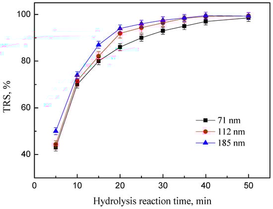 Along with the reaction time increased, 15 μL of the clear solution from the hydrolyzate was transferred to a vial every 5 min, while 1 mL of chromogenic agent (3,5-dinitrosalicylic acid, DNS) and 3 mL of deionized water were added. Then, the resulting solution was heated for 5 min in boiling water and 6 mL deionized water was added after cooled in the ice water bath. The principle of determination is that DNS is reduced to a brown red amino compound (3-amino-5-nitrosalicylic acid) after heating with reducing sugar hydrolyzed by polysaccharides under neutral or alkaline conditions. Finally, the absorbance was measured at 540 nm using UV-Vis double beam spectrophotometer (UV4802, Unico, Los Angeles, CA, USA). Reducing sugar concentration in the solution was calculated by employing a standard curve prepared using glucose. TRS can be calculated by the following equation: