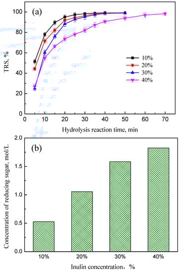 The effect of the inulin concentration on the hydrolysis reaction was studied experimentally. The hydrolysis results were presented in Figure 9. As shown in Figure 9a, when the amount of inulin concentration increased from 10% to 40%, the growth of hydrolysis ratio was slowed down and it took a longer time for complete hydrolysis of inulin. When the concentration of inulin was lower than 30%, the inulin almost could be completely hydrolyzed in 35 min. The PEK-C-ILs powders catalyst exhibited excellent hydrolysis performance with yields up to 90% under these three kinds of inulin concentration at 25 min. However, when the inulin concentration was more than 30%, the hydrolysis rate of inulin was obviously decreased. The TRS yield at 25 min was only 78.1%. This result can be explained in terms of dissolution mechanism and diffusion mechanism. A higher inulin concentration strongly increases the molecule diffusion resistance, which is not conducive to the process of mass transfer. In addition, the solubility of inulin is about 6–35% under different temperature [], so the dissolution of inulin with concentration of 40% was reduced, resulting in the hydrolysis rate decreased.