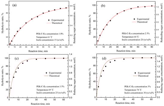 To validate the kinetic model, its predictive catalytic performance was tested with a group of experimental data. Figure 10 demonstrates that the theoretical calculation results were in very good accordance with the experimental results and the relative error was less than 3.0%. It is clear that all the experimental data fit reasonably well with the kinetic values under different inulin concentration. Meanwhile, as shown in Figure 10d, it can be observed that the average variance has a tendency to increase with the increase of reaction time under the higher inulin concentration. It is mainly because of the increased mass transfer resistance of diffusion, which is reflected in two aspects: (i) the transfer resistance of inulin from outside into pore, (ii) the release resistance of the hydrolyzed fructose from pore into solution. However, the corresponding average variances were only 7.7%. Therefore, we can conclude that the kinetic model can be used to predict the performance of the PEK-C-ILs catalyst.