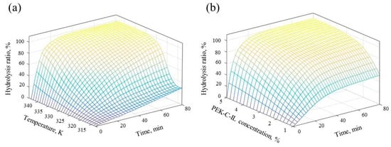 Response Surface Methodology (RSM) can be regarded as a collection of statistical and mathematical techniques useful for optimizing objective functions. Thus, in order to investigate the effects of two independent variables on the yield of reducing sugars, the RSM experimental design was carried out. The analysis results were shown in Figure 11. It could be seen that the relative rate of inulin hydrolysis is enhanced by increasing the temperature and catalyst concentration. Figure 11a shows the surface representation of inulin hydrolysis ratio at 4.0% PEK-C-ILs concentration over the temperature range from 300.15 K to 348.15 K and reaction time from 0 min to 80 min. And the relationship between measured inulin hydrolysis ratio, PEK-C-ILs concentration (1.0–5.0%) and reaction time (0–80 min) at temperature 338.15 K was shown in Figure 11b. Analyzing the reducing sugars yield response surface will provide the useful information about operational conditions and results and understand the property-condition relationship of PEK-C-ILs catalyst.