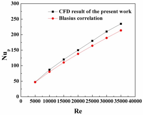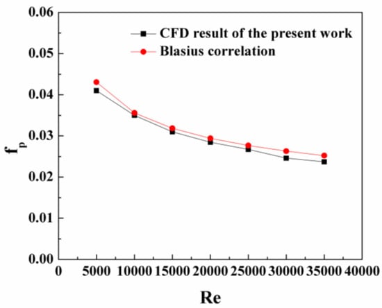 To verify the numerical method described above, we compare the computational results of the Nusselt number and friction factor with the well-known empirical formulas for plain tubes, as shown in Figure 3 and Figure 4, respectively. It is clear that the CFD results are in good agreement with the empirical correlations, showing less than 10% and 3.1% deviation for the Nusselt number and friction factor, respectively. The empirical formulas for the plain tube based on the Dittus–Boelter equation and Darcy–Weisbach equation are written as follows [23]: