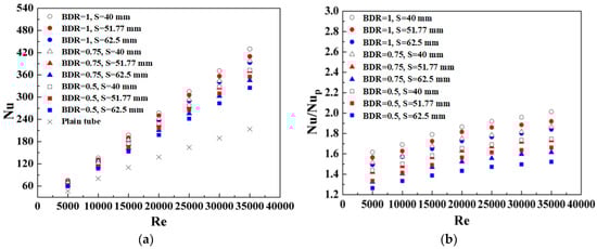 The effects of using the BT with different diameter ratios (BDR = 0.5, 0.75 and 1) on the heat transfer enhancement are shown in Figure 5a,b. At the given Reynolds number, the Nusselt number (heat transfer rate) in the tube equipped with BTs is higher than that in the plain tube for the whole test range. It is also noted that the use of BTs helps enhance the heat transfer rate by about 1.26–2.01 times that of the plain tube. This can be attributed to the thermal boundary layer destruction caused by the BTs.
