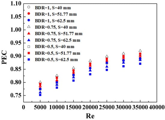 The PEC values of the enhanced tube with BTs are illustrated in Figure 8. In all cases, the thermal performance factors are below unity, but the PEC values increase with an increase in the Reynolds number. In general, both the Nusselt number ratio and friction factor ratio increase with the increase of the Reynolds number, as respectively shown in Figure 5b and Figure 6b. However, the effect of the Nusselt number ratio is dominant over the friction factor ratio when a high Reynolds number is used, resulting in the increase of thermal performance factor. Moreover, it is noted that when a smaller spacer length (S = 40 and 51.77 mm) is used, the PEC values for BTs with smaller diameter ratios (BDR = 0.5 and 0.75) is higher than the diameter ratio of BDR = 1. The reason can be explained by the fact that using a smaller spacer length between the BTs is more effective to frequently disturb the boundary layer, which leads to stronger disturbance upon the fluid. This result suggests that it is preferable to use a smaller ball diameter ratio and a smaller spacer length for the design of BTs.