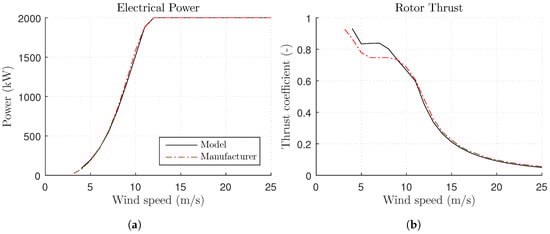 Comparison of the manufacturer’s data and the developed model for the (a) electrical power and (b) rotor thrust as a function of the wind speed.