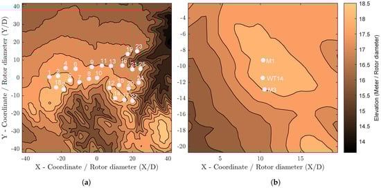 Computational layouts of the (a) Shaanxi wind farm with twenty-five wind turbines and of (b) wind turbine 14 with met masts M1 and M3. The wind turbines are labeled from 1 to 25.