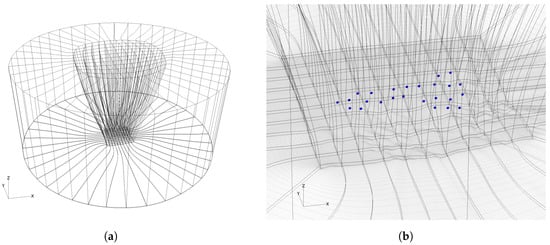Sensors are placed at hub height for all twenty-five wind turbines as well as on the met masts in the CFD setup. The (a) outer and (b) terrain computational grids for the AD-RANS computations are shown in Figure 3. Each AD-RANS computation is performed using one-hundred-and-forty 2.8 GHz processors on a Linux cluster, where each processor is allocated for two blocks out of the 280 blocks. Each AD-RANS computation requires approximately 3 to 4 h for completion.