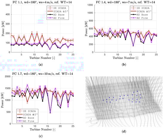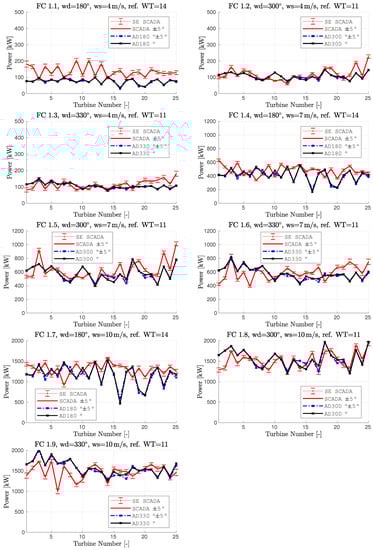 Figure 5 contains the results for the flow cases defined in Table 2, which consist of the AD-RANS results and the comparisons with the measurement data from SCADA. The notation wd and ws shown in the title for each figure denotes wind direction and wind speed, respectively. The wind direction corresponds to the measurements on met masts M1 and M3, while the wind speed corresponds to the measurements on the reference wind turbine (ref. WT). The figure contains the predicted, labeled as AD# and AD# ± where # is the wind direction in degrees, and measured, labeled as SCADA, electrical power output for all 25 WTs. Each WT is labeled between 1 and 25, refer to Figure 2a. The AD# results represent a single run with the wind direction, #, which is also specified in the sub-figure titles. The AD# ± results represent the average of five runs: , , 0, , and degrees relative to wd. For example, AD# for FC 1.1 is a single run at 180 degrees (# = ), and AD# ± is the average of 5 runs: 180 − 5, 180 − 2, 180, 180 + 2, and 180 + 5 degrees. The SCADA measurements represent averaged values in ±5 degree bins. Although difficult to see, the standard error (SE) in Figure 5 is equal to SCADA ± but includes the error bars (may require zoom-in).