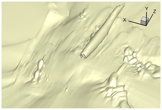 Iso-surface of vorticity for the actuator line large-eddy simulation of wind turbine 14 without synthetic inflow turbulence for 7 m/s wind speed and 180 degrees wind direction (south to north). The domain shown is the same as in Figure 4b.