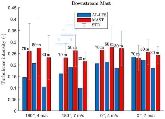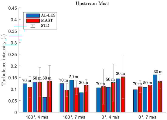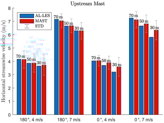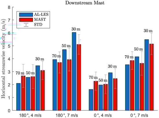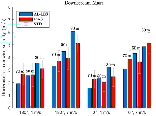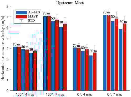 Figure 9, Figure 10 and Figure 11 are the results in Table 5 displayed in a bar-chart format. The results for the horizontal streamwise velocity comparisons are grouped by upstream (Figure 9) and downstream (Figure 10) locations. In Figure 9 and Figure 10, bars are paired to represent comparisons between AL-LES and measurements for each one of the sensor locations: 70 m, 50 m and 30 m heights on the met mast. The horizontal streamwise velocity comparisons for the upstream mast in Figure 9 are in better agreement than the comparisons for the downstream mast shown in Figure 10 for two reasons. First, as mentioned in Section 2.3, the flow field in the AL-LES was scaled with the measurements using the sensor at 70 m height on the upstream met mast. Second, as mentioned previously for Table 5, larger differences occur for the downstream mast because of the complexity and stochastic nature of the turbulence generated from the wake of WT14. The wake of WT14 introduces larger variations and uncertainty in the flow field. In Figure 11, the largest difference between the AL-LES and SCADA appears for the power in the 0 and 7 m/s flow case. All the other comparisons in Figure 11 generally agree.