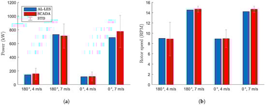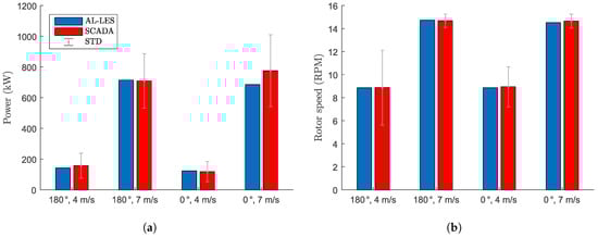 Comparison of mean AL-LES results with synthetic inflow turbulence and SCADA for (a) power and (b) rotor speed of wind turbine 14 for the four FC2 flow cases. STD is the standard deviation of the measurements for a 1-year period.