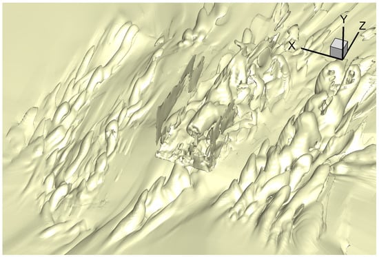 Figure 12 depicts the iso-surface of vorticity for the AL-LES simulation of WT14 with synthetic inflow turbulence at the 7 m/s wind speed and 180 degrees wind direction. In Figure 12, the synthetic turbulent inflow input is seen by the rectangular plane, 372 × 372 m in size, 2.5 rotor diameters upstream of the wind turbine. Since slices from the Mann turbulence box were gradually fed into the plane during the unsteady simulation, a rectangular box is seen encompassing the wind turbine and its wake. The comparison of AL-LES results with measurement data is shown in Table 6.
