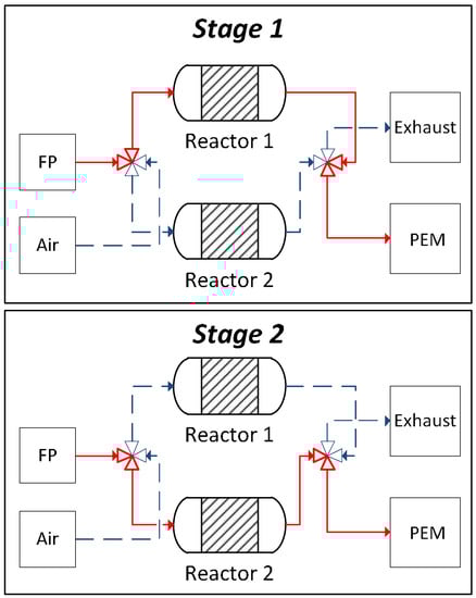 The block flow diagram (BFD) of the process here proposed is shown in Figure 1. It consists of two parallel catalytic reactors which alternatively operate as trap for CO and as reactor for the oxidation of CO adsorbed. In Figure 1, during Stage 1 Reactor 1 operates as a CO adsorber with the inlet stream coming from the FP, thus providing a CO-free exiting flow for the fuel cell, while Reactor 2 is regenerated by flowing air. During the Stage 2, the roles of the reactors are inverted.