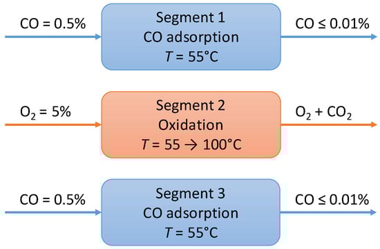 - Segment 1—Isothermal adsorption. T = 55 °C, CO = 5000 ppm in N2 flow. When the CO concentration reaches 100 ppm the reactor is by-passed.