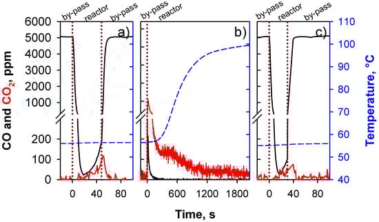 The outline of the whole experiment is reported in Figure 2. A 5% CO/N2 mixture was suitably pre-mixed with pure N2 to obtain 5000 ppm CO in Segment 1, whereas pure O2 was pre-mixed with pure N2 to feed 5% O2/N2 in Segment 2. All gas flows were controlled by MFC and were dried by passing through a CaCl2 trap before reaching a Fisher-Rosemount NGA2000 (St. Louis, MA, USA) continuous analyzer for CO, CO2, and O2. The feed mixture did not contain H2 due to the negligible effect of this component at temperature <80 °C [].