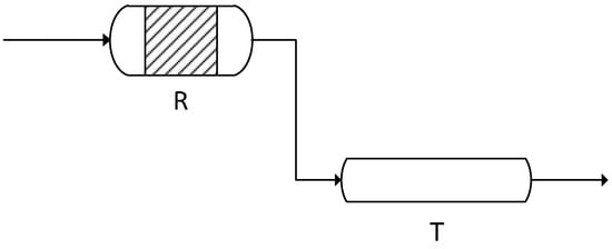 Regarding the balance on gas phase species, we assumed the reactor was composed by two vessels (R) and (T) (Figure 4). The vessel R is the catalytic reactor, while T is representative of the tube connecting the reactor (R) and the analyzer, whose residence time represents the delay time between gas species’ exit from the reactor and their detection in the analysis system.