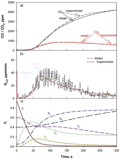 Experimental (dashed lines) and model (solid lines) CO and CO2 concentrations (a) and CO reaction rate (b) as a function of time during the adsorption. Site concentrations (c) as a function of time during the adsorption. T = 55 °C, COin = 5000 ppm (ϑi = fraction of site i).